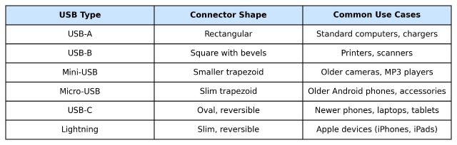 USB-C has become the preferred port for many contemporary devices, attributed to its remarkable features. However, the older ports, like USB Type-A and USB Type-B, remain quite relevant in our daily lives. In fact, they still appear across various devices, with Type-A being significantly more prevalent than the Type-B port. Therefore, if you’re uncertain about the different types of USB ports and their functionalities, here’s a brief overview of the various connectors you may come across on different devices, inclusive of their appearance and capabilities.