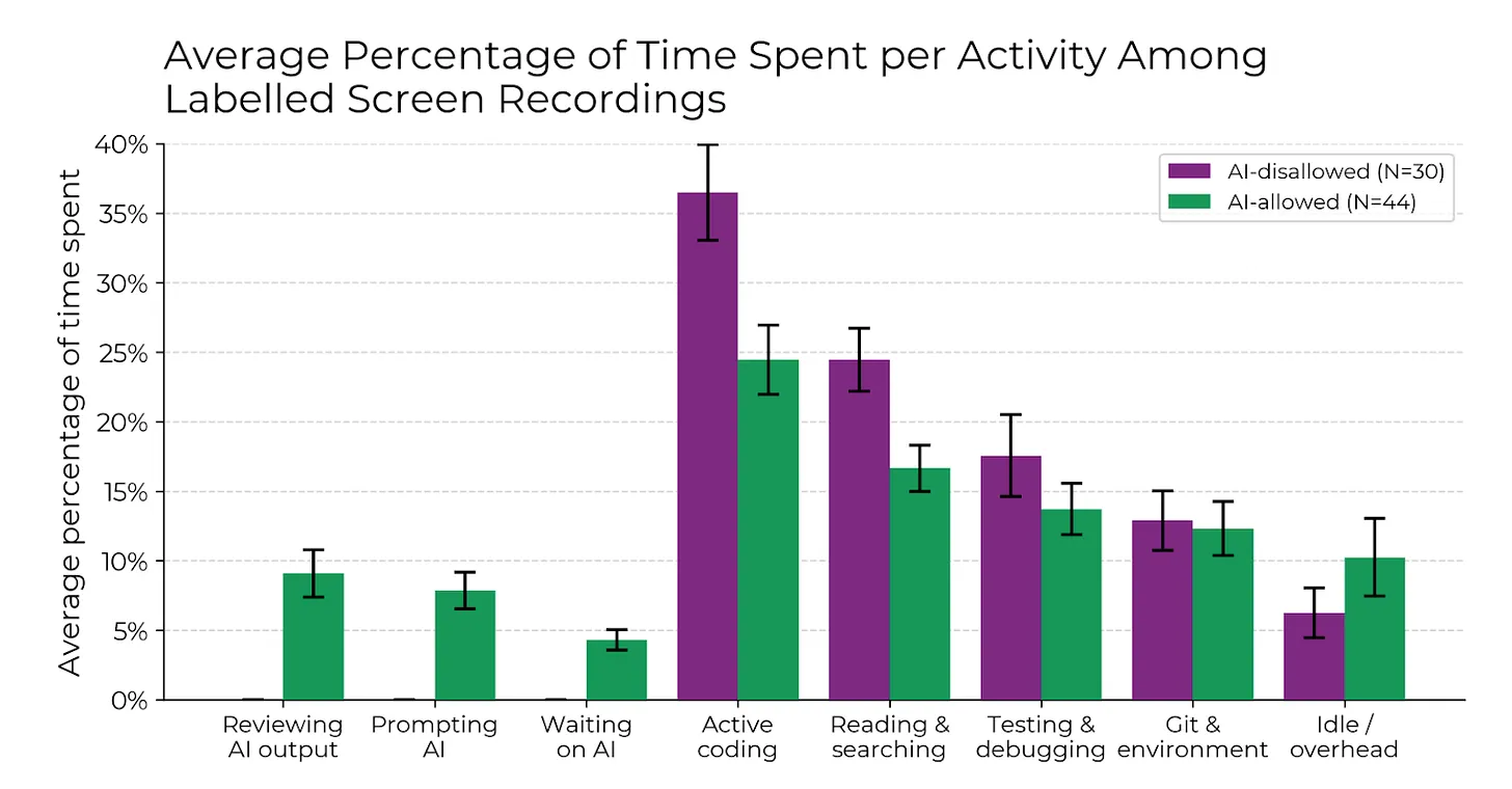 An intriguing study was released by the nonprofit Model Evaluation and Threat Research (METR). They hired 16 seasoned developers working on large open-source repositories to fix 136 real issues, paying $150/hour. Some developers used AI tools, while others did not. The study recorded the developers’ screens, analyzing 146 hours of footage. The findings: